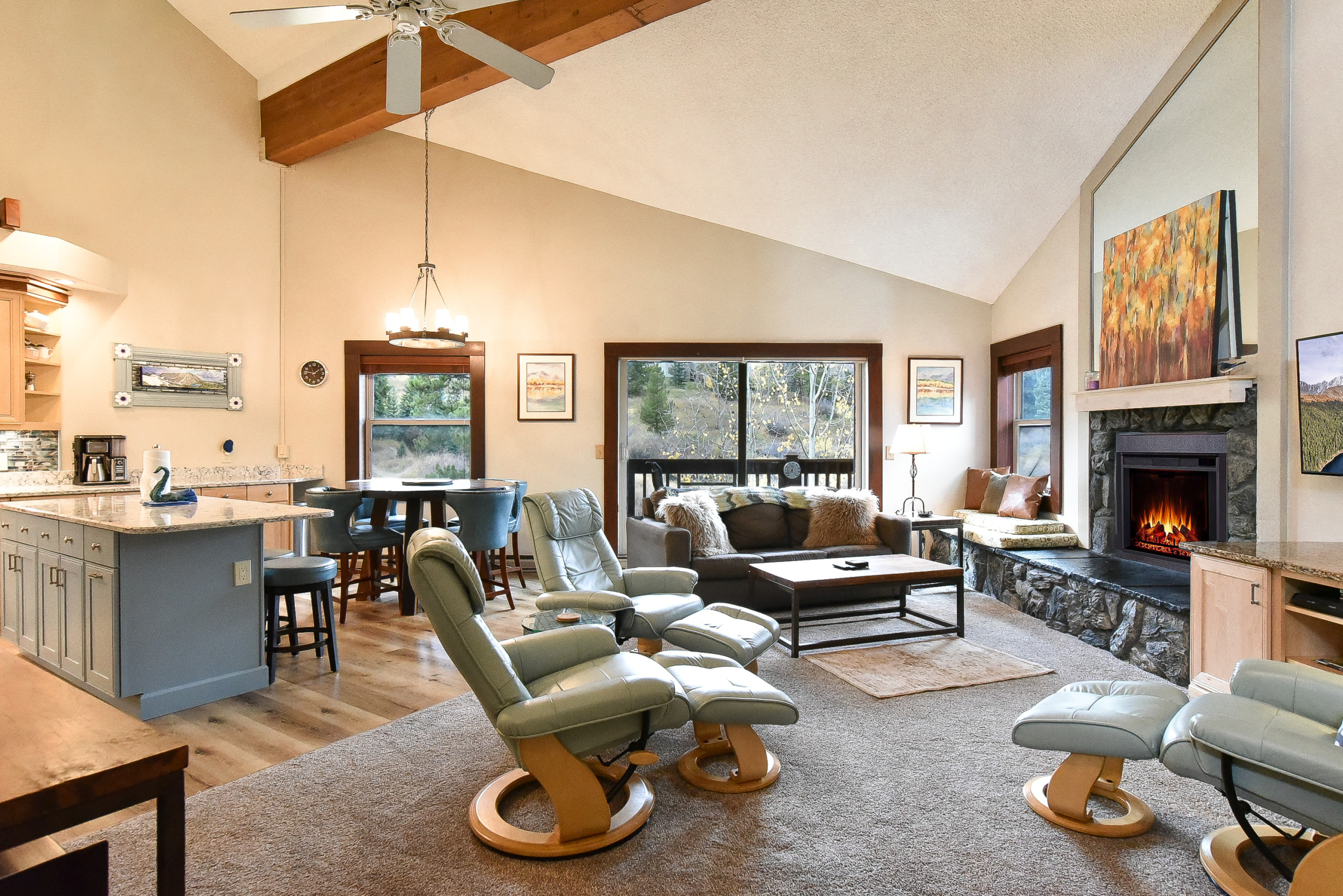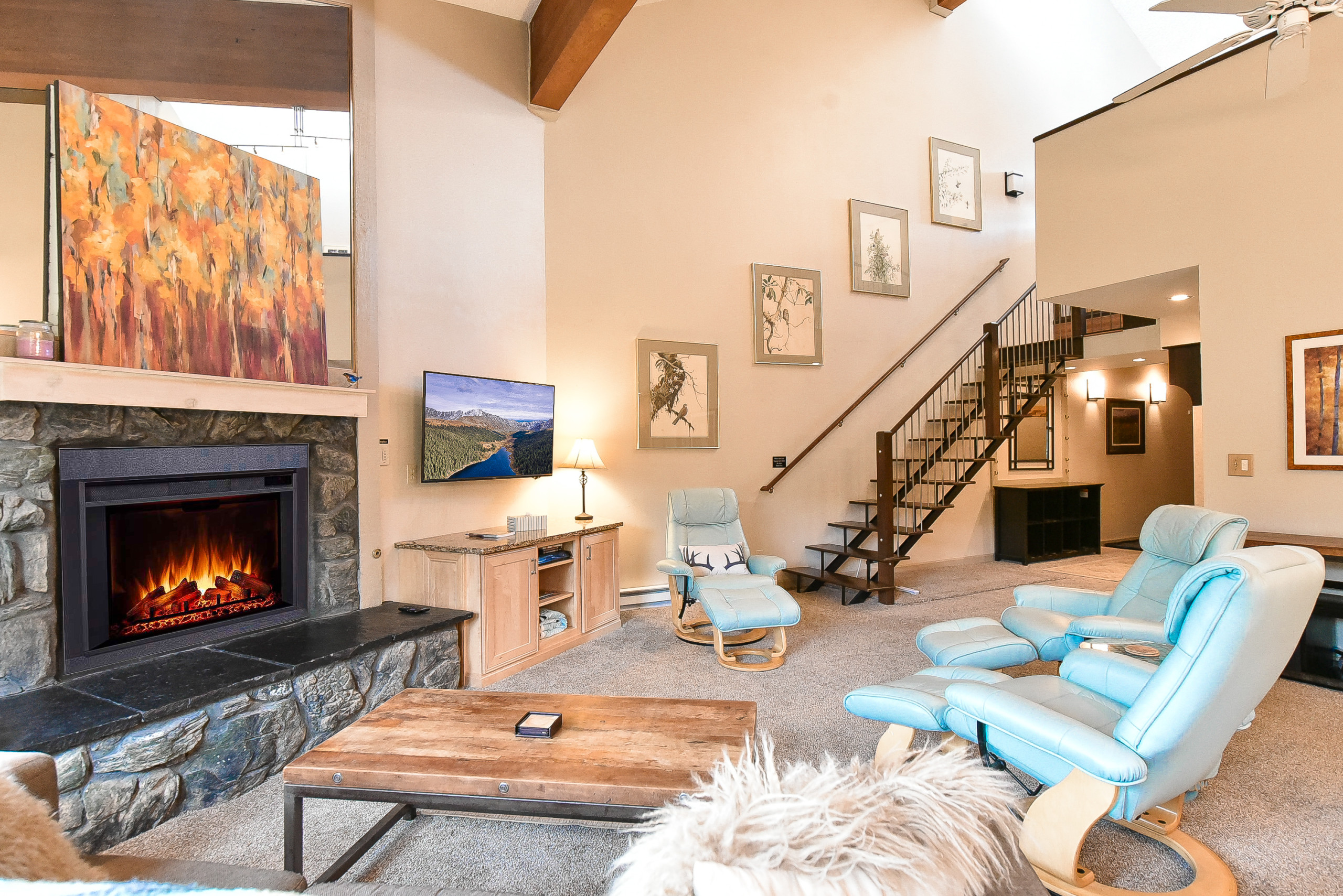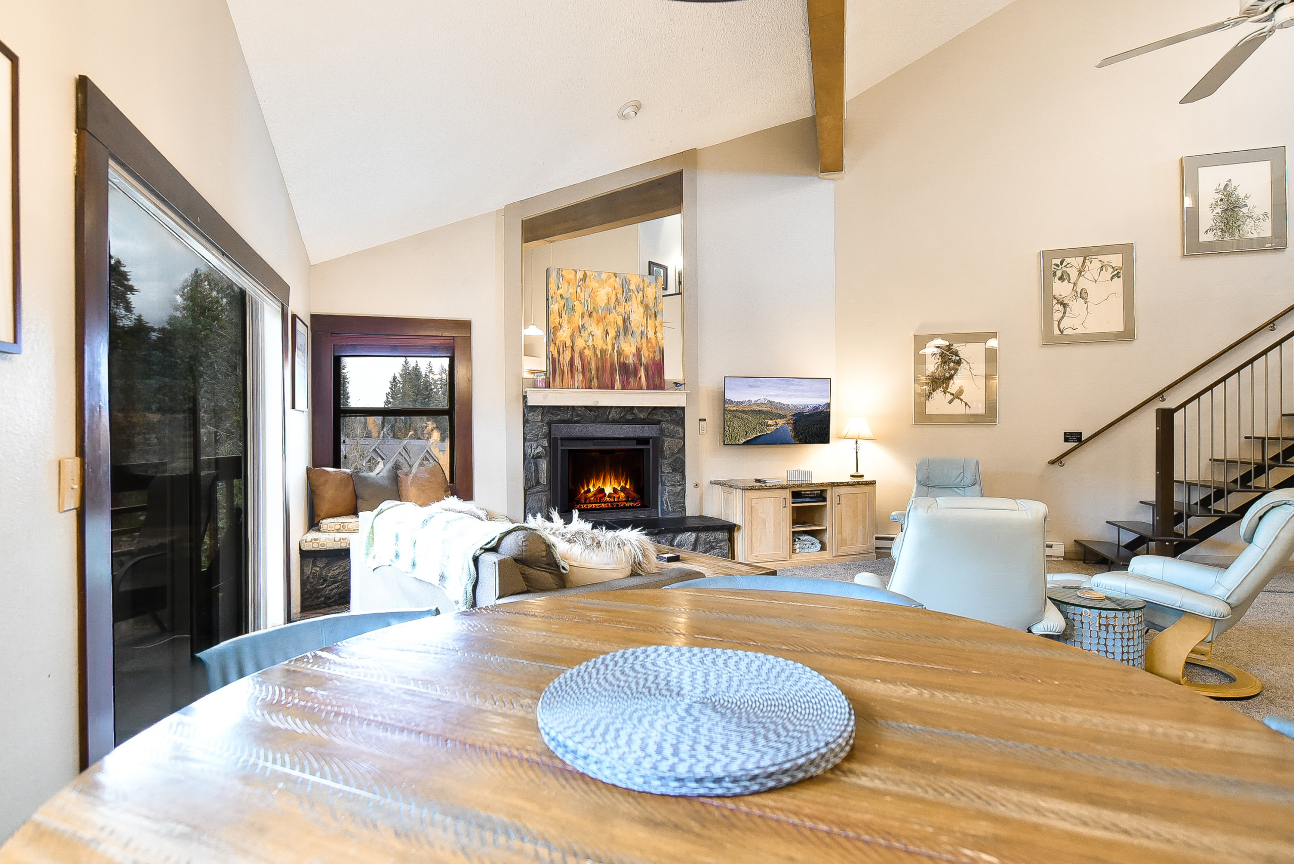 The Living room has plenty of room to gather together and cozy up by the fire, read a book, or use your personal favorite streaming apps on the flat-screen TV.