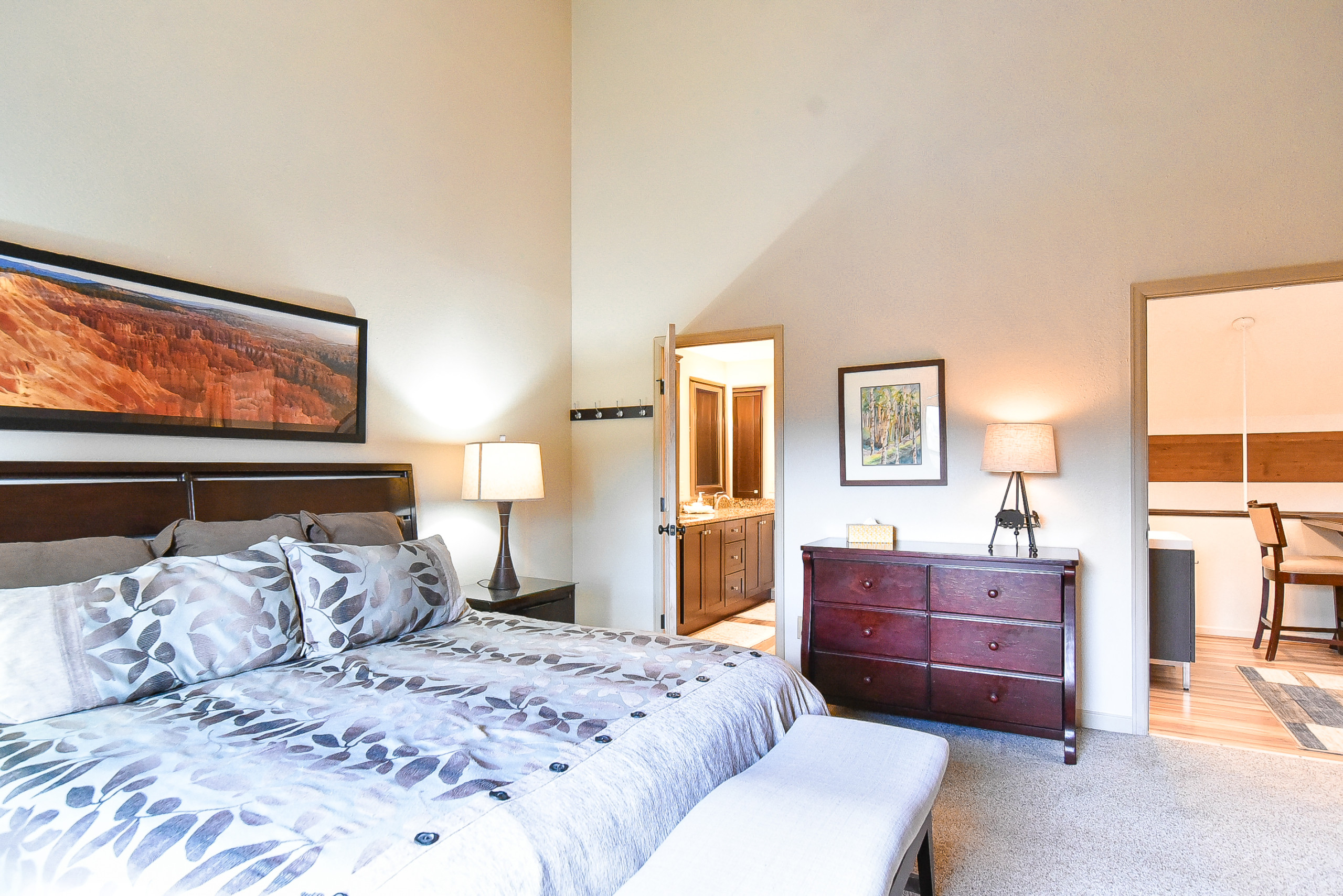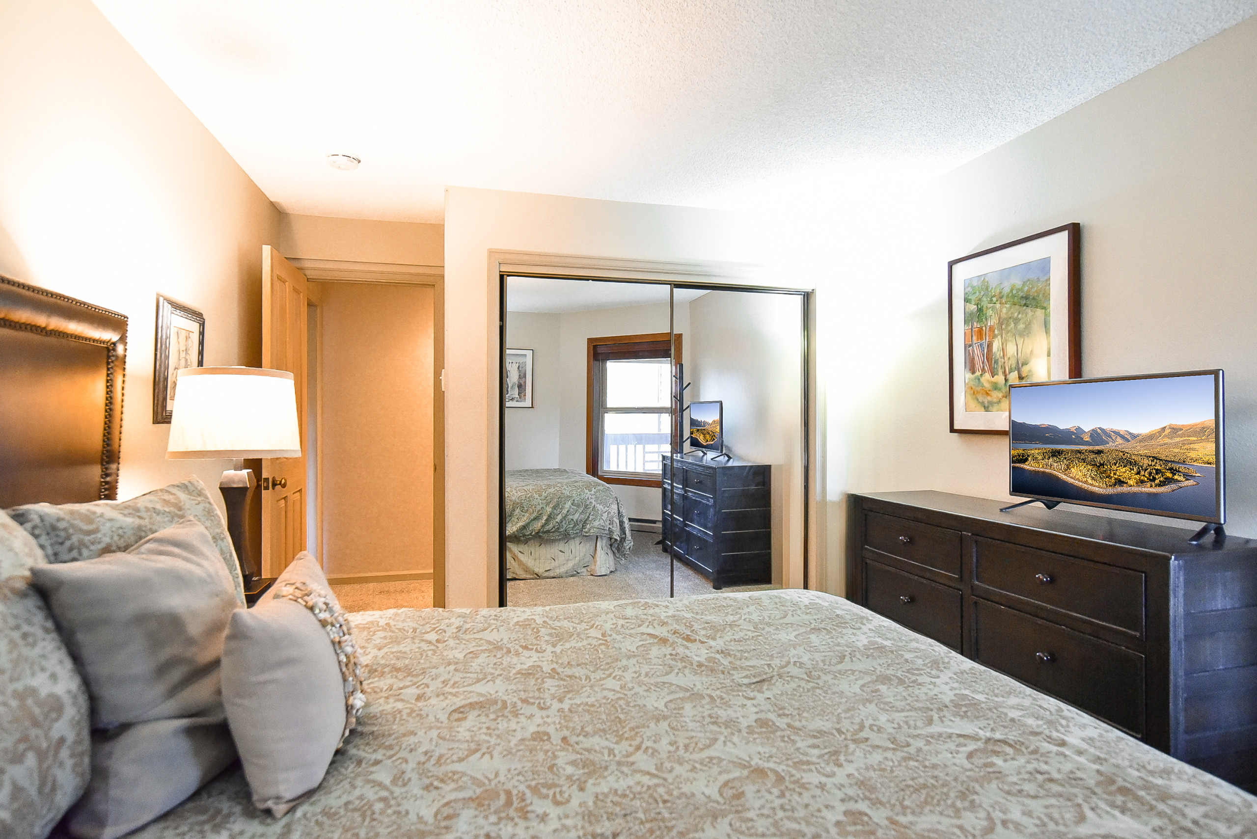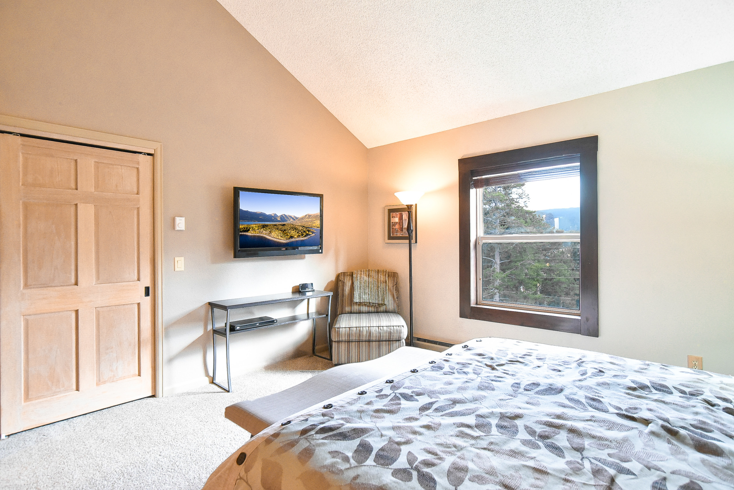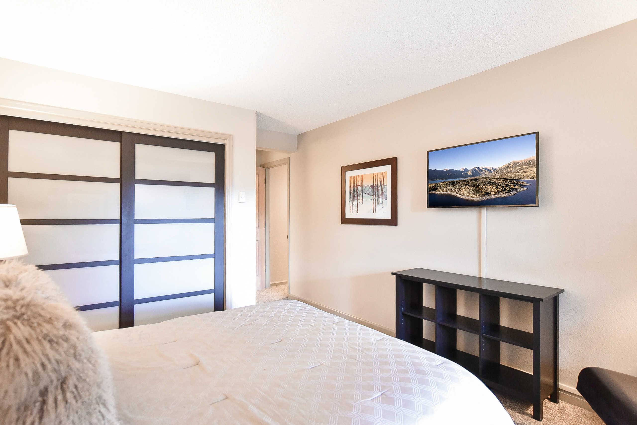 Master Bedroom with ensuite - The master bedroom is located on the lower living level. There is a Queen bed and closet and flat-screen TV. The ensuite bathroom has a sink area and a separate WC with a toilet and tub/shower combo.
