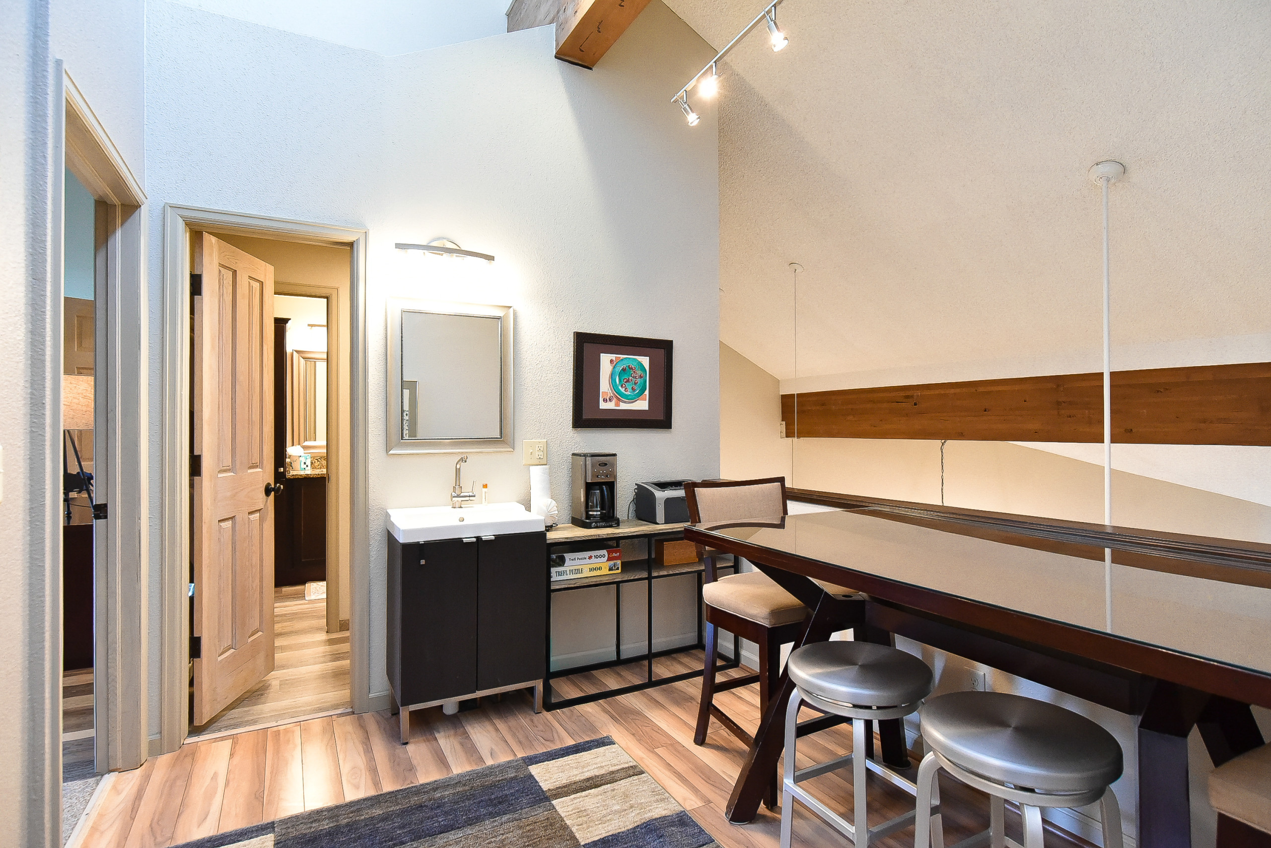 Living Room/Dining Area - The living room has a gas fireplace, large flat-screen TV, and a hip décor that makes this place special. The open floor plan is perfect for enjoying family or friends. The dining area seats 8 with seating the table, the bar and 2 additonal stools.