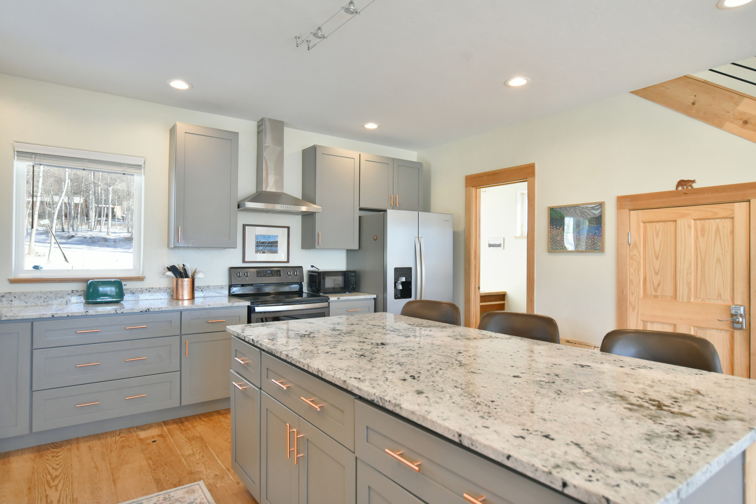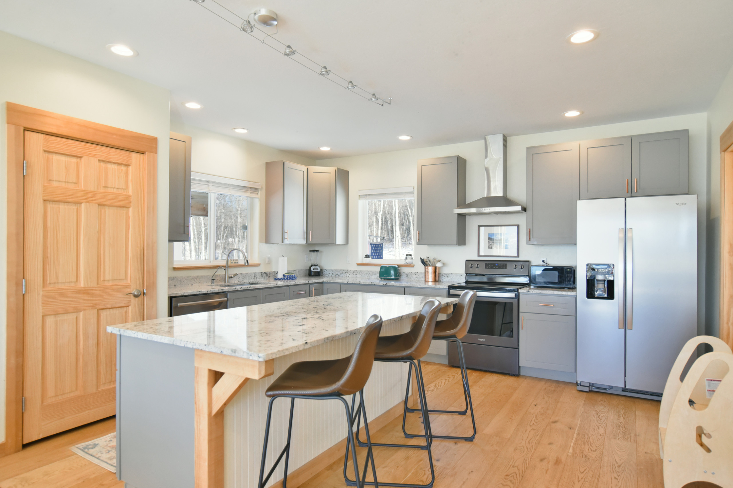The fully stocked kitchen is designed for easy meals and gathering, with a dining table and bar seating for casual dining. Multiple TVs throughout the home offer space to relax and unwind after skiing, hiking, or exploring the area.