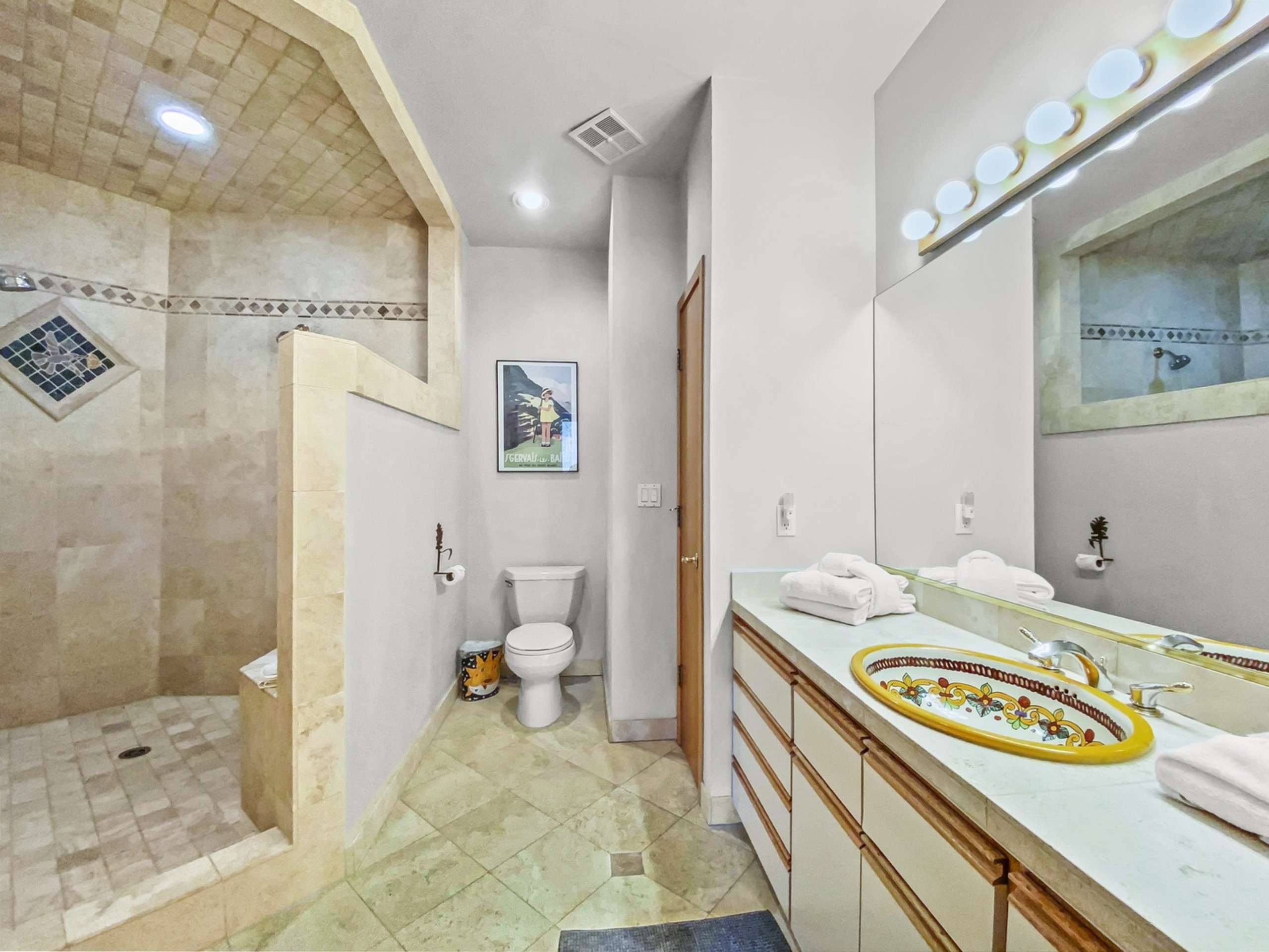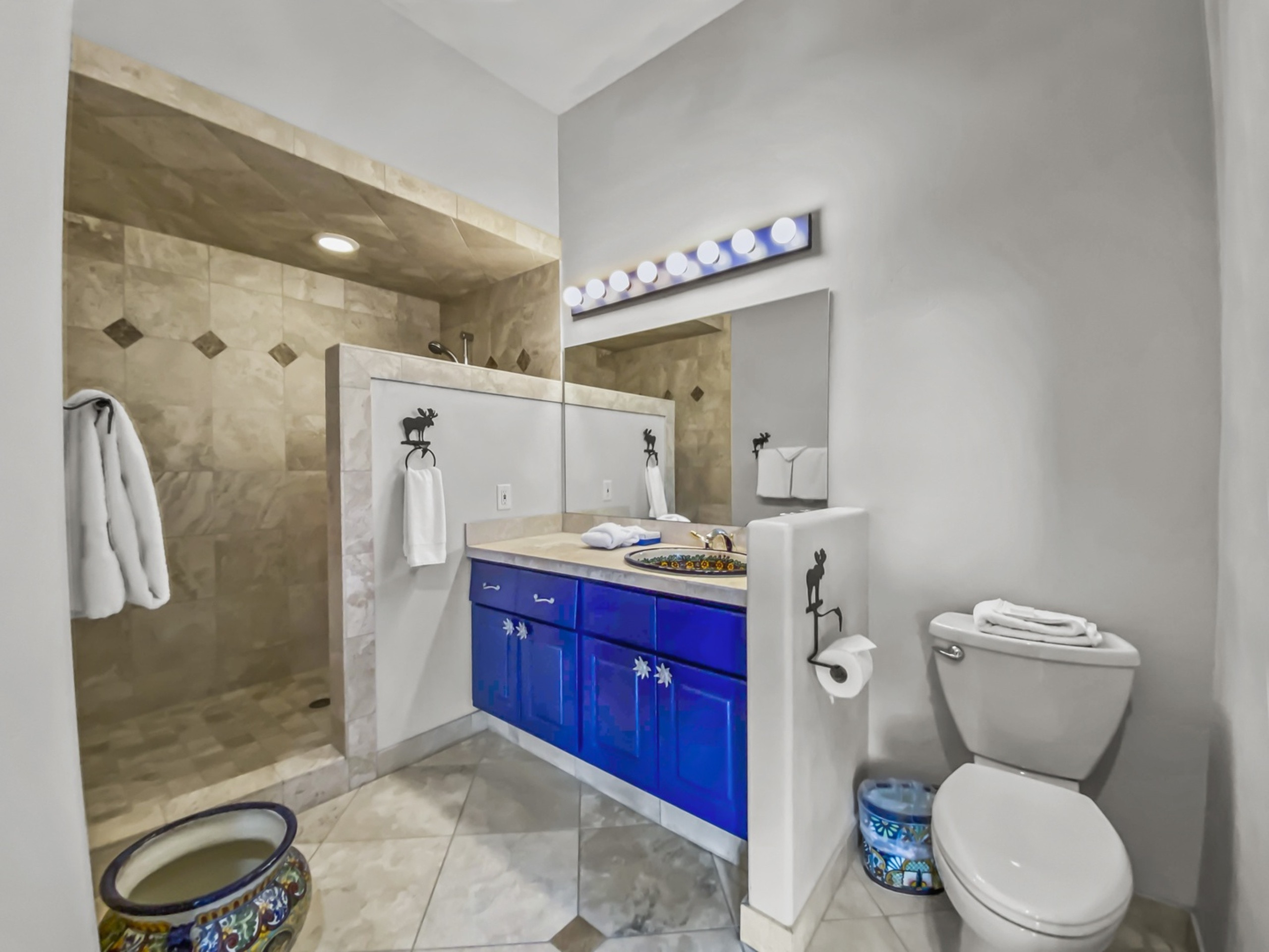 • Queen Primary Suite: Queen bed, ensuite bathroom with walk in shower, patio access, and smart TV