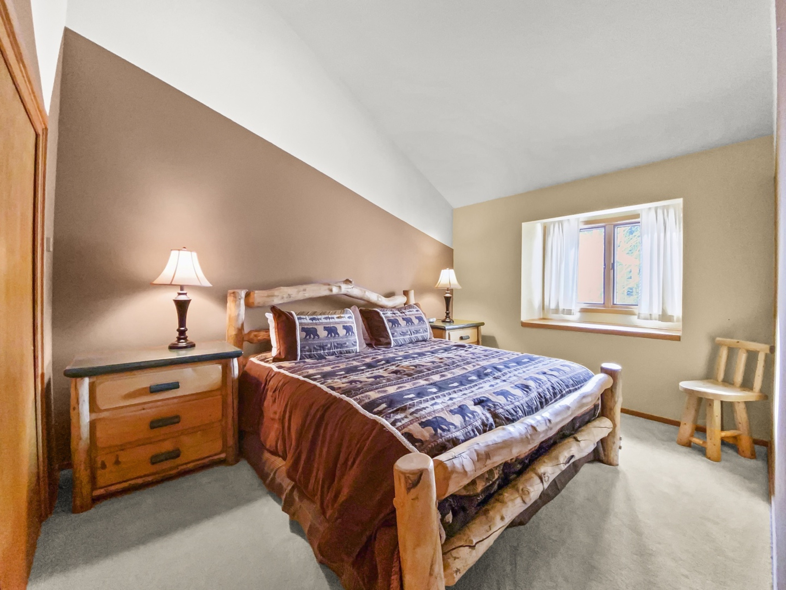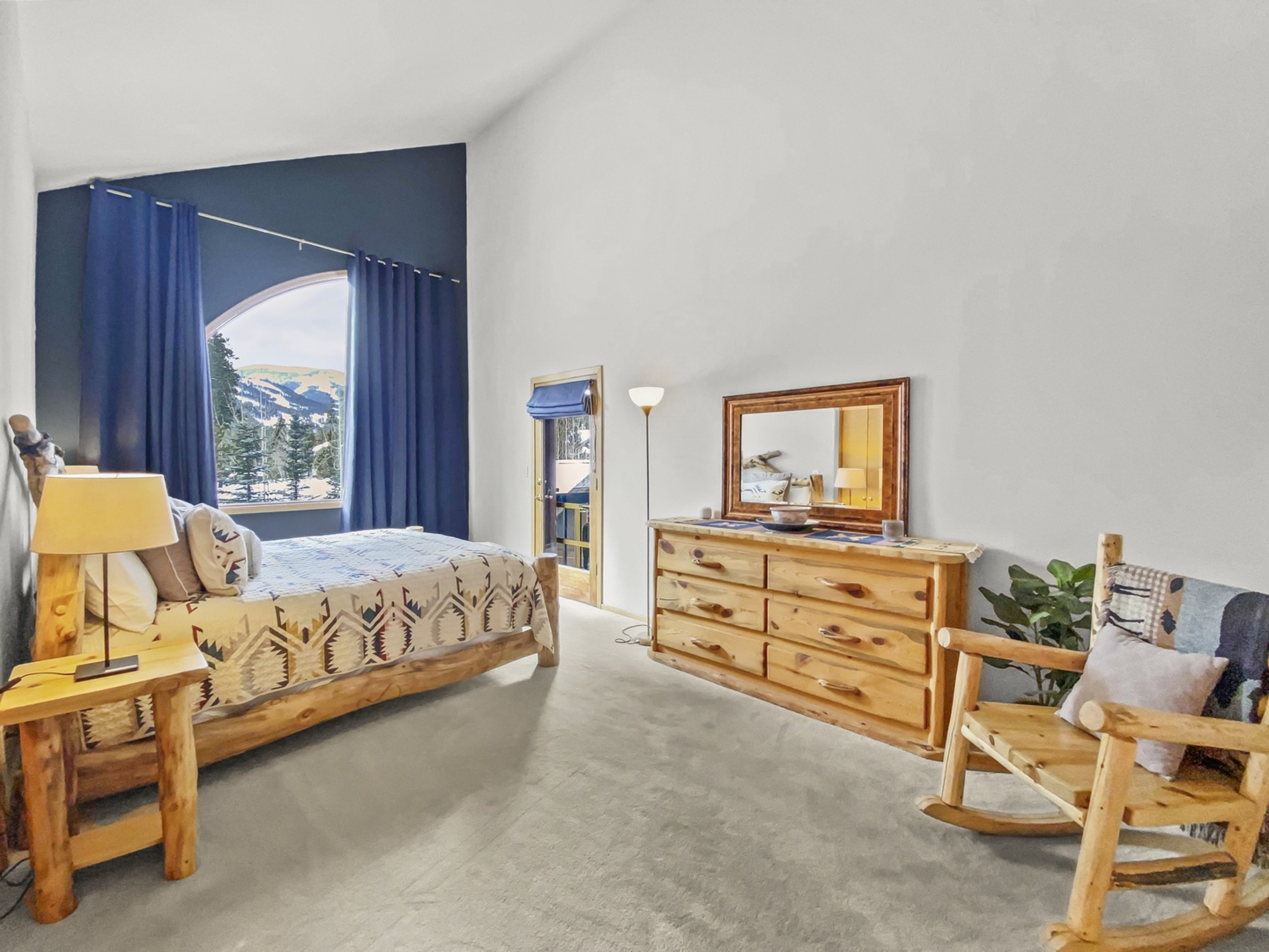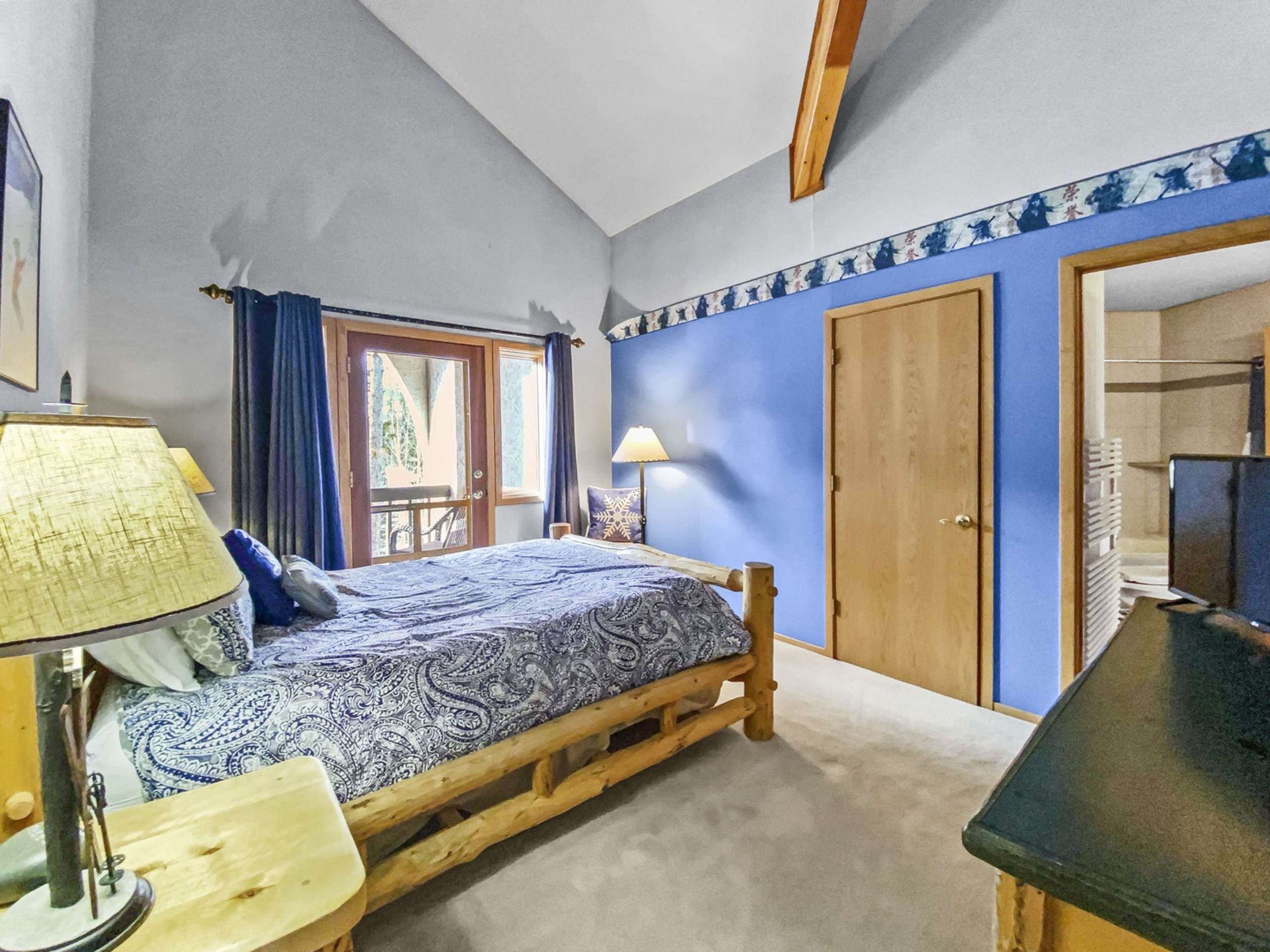 • Queen Bedroom: Queen bed, vaulted ceilings, and private balcony