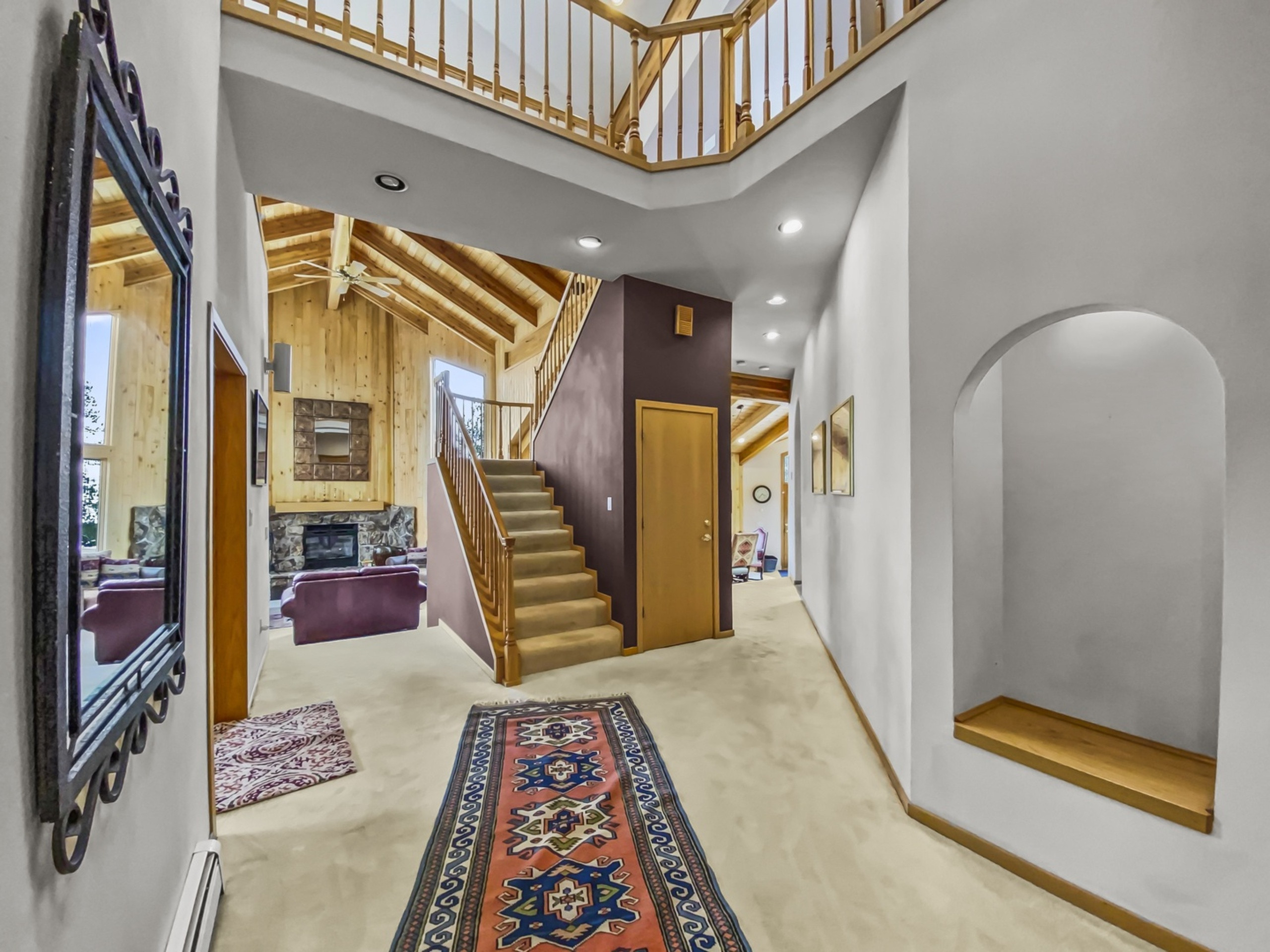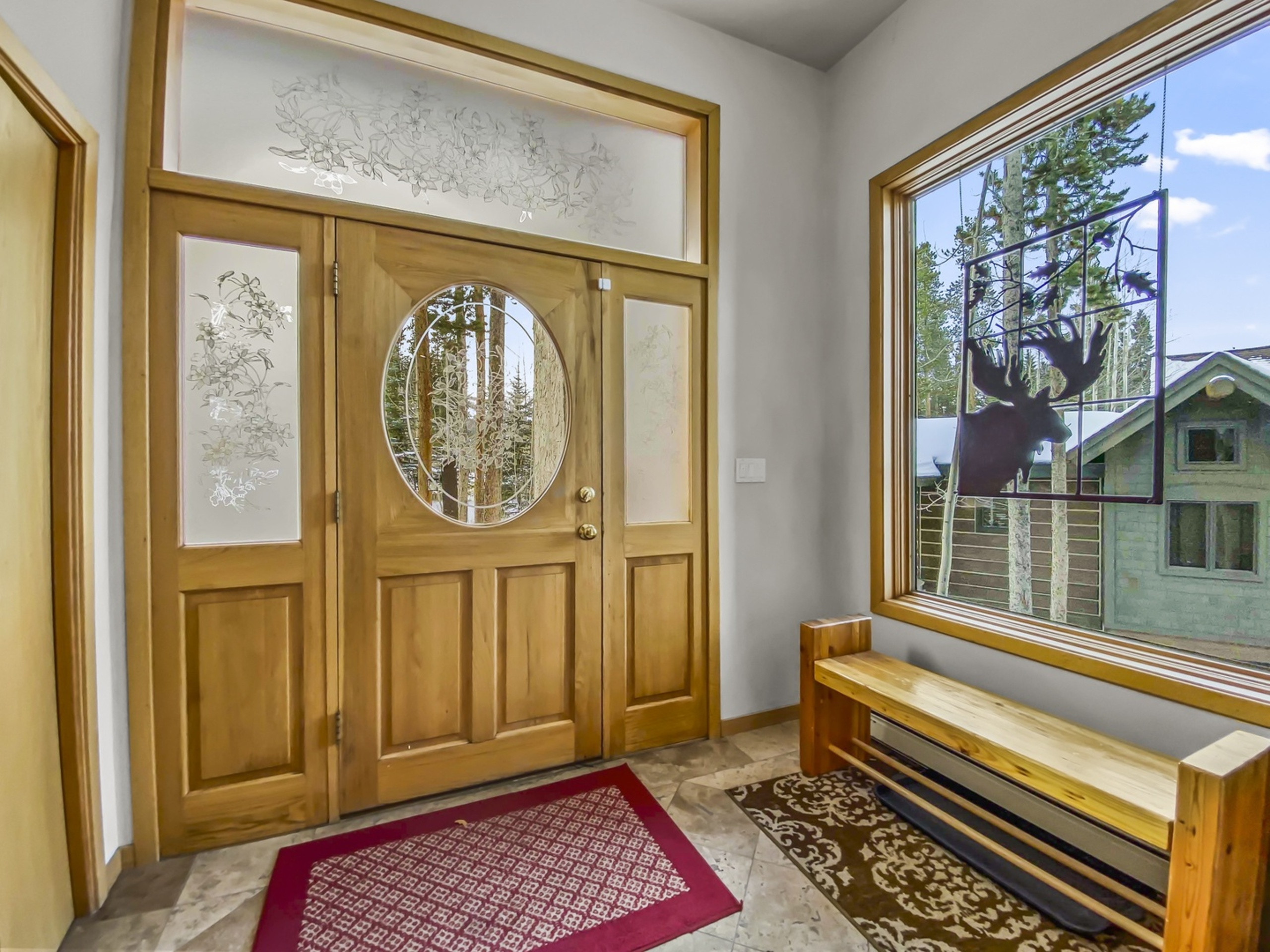 There is an inviting front door area with a porch bench and some special wood-carved mountain creatures to greet you. In the large entry hall, you will find a closet for coats and shoes. Also on the Entry Level is a full-size washer and dryer. The ideal location to toss dirty play clothes and coats as you enter the home.