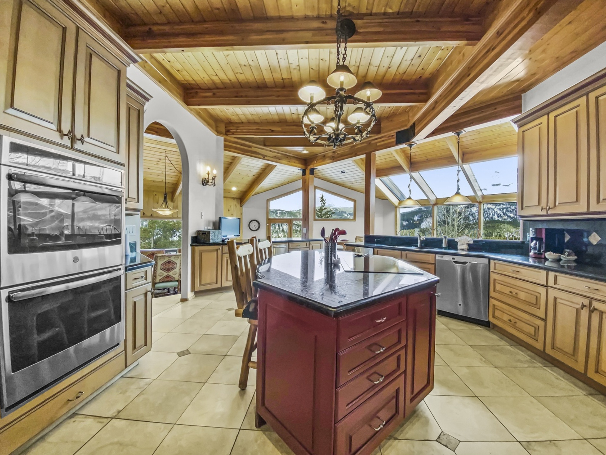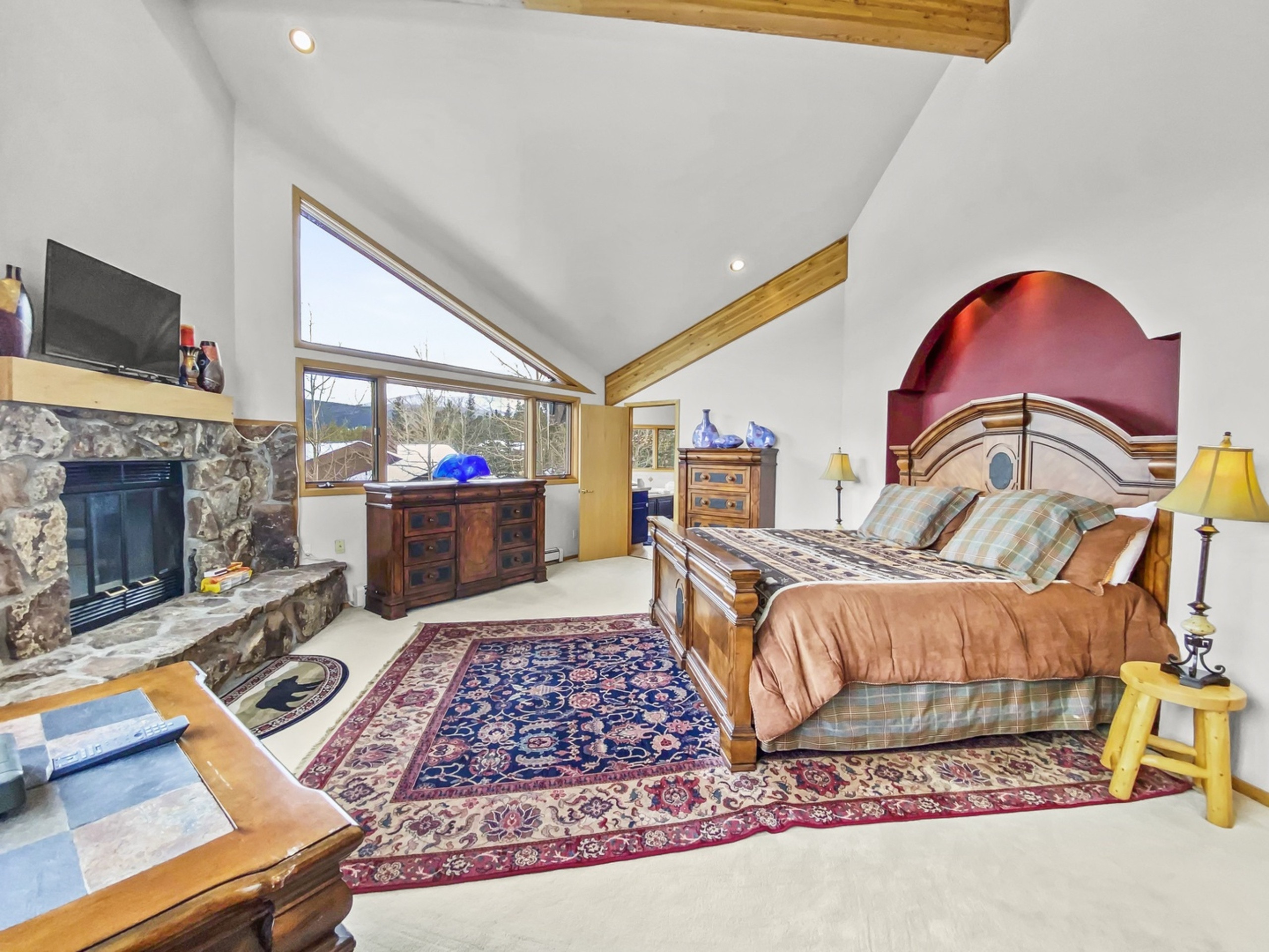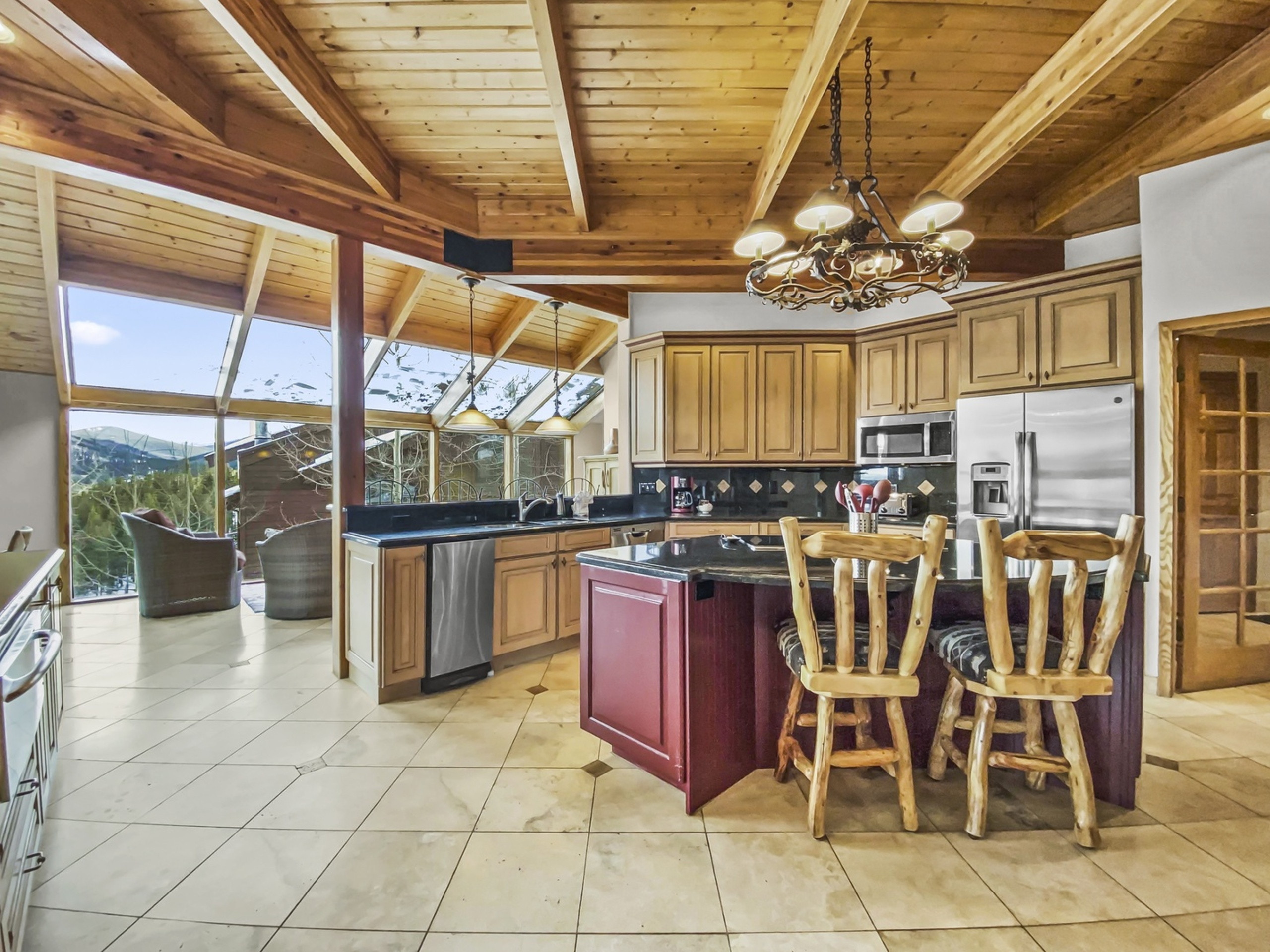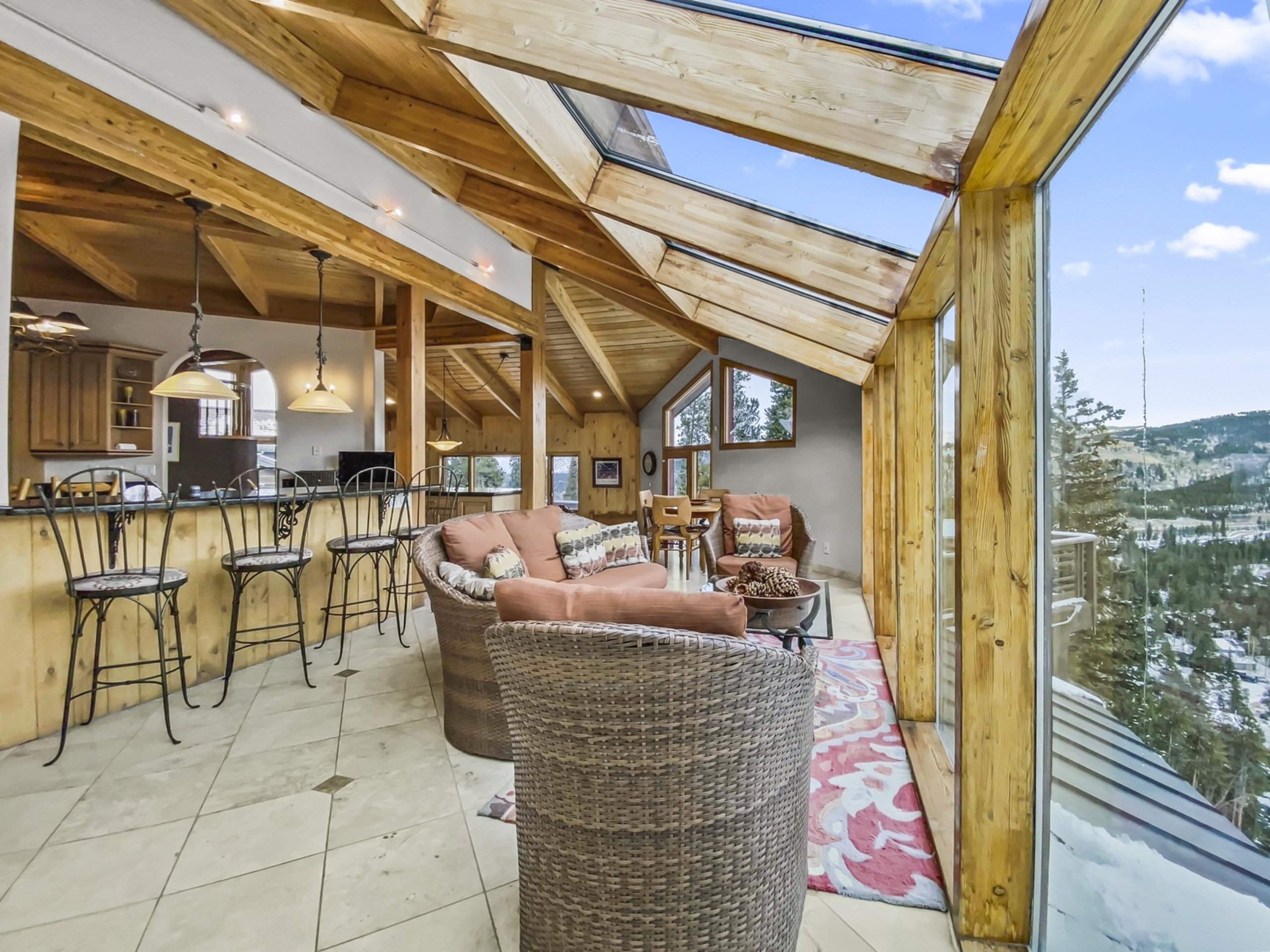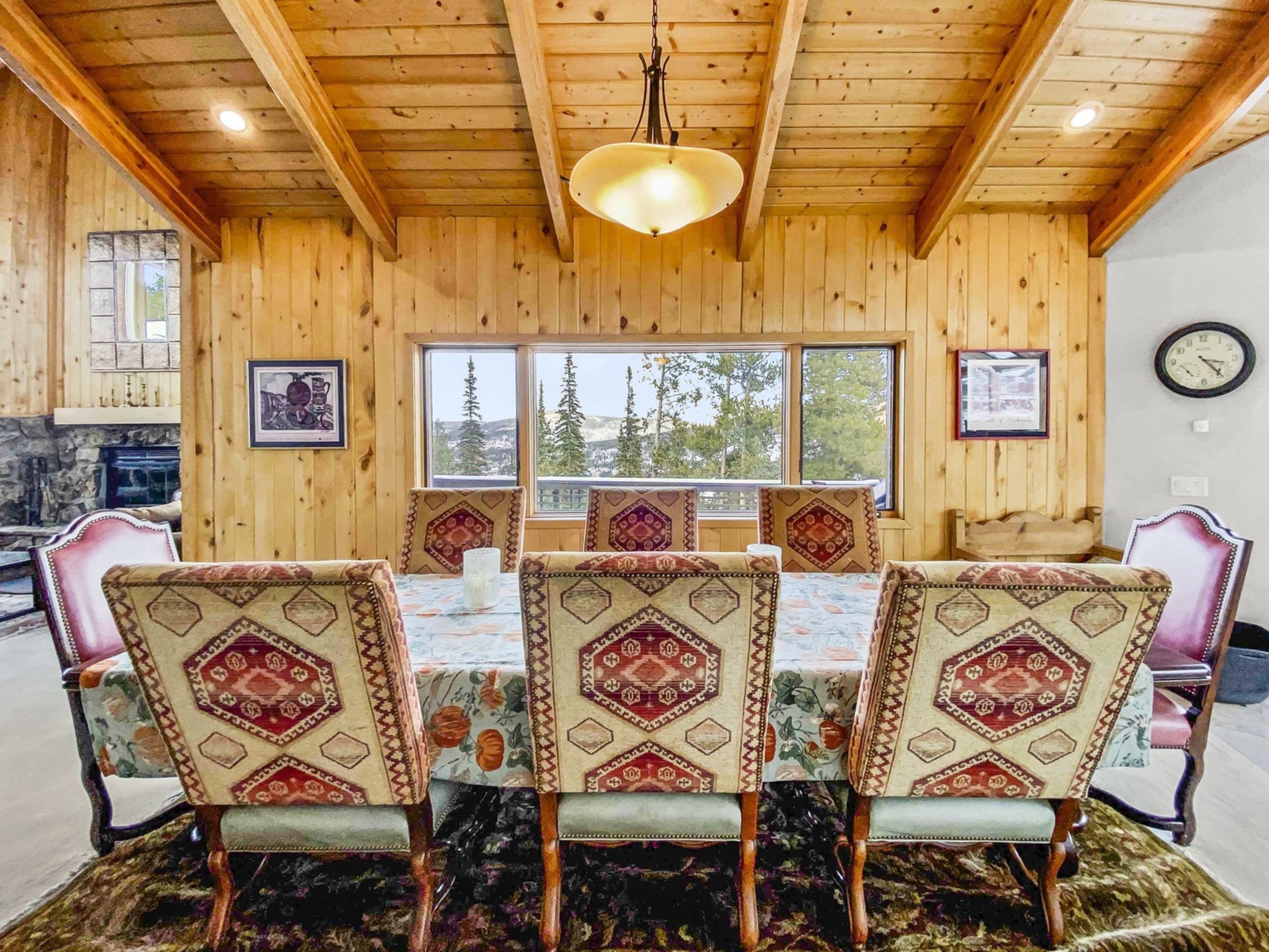 The Great Room boasts a fantastic wooden moose, floor-to-ceiling windows inviting high country sunshine, or a magical snow globe on winter days. Enjoy the ambiance and heat from the majestic stone gas fireplace and settle into the comfy leather couches and cozy armchairs.